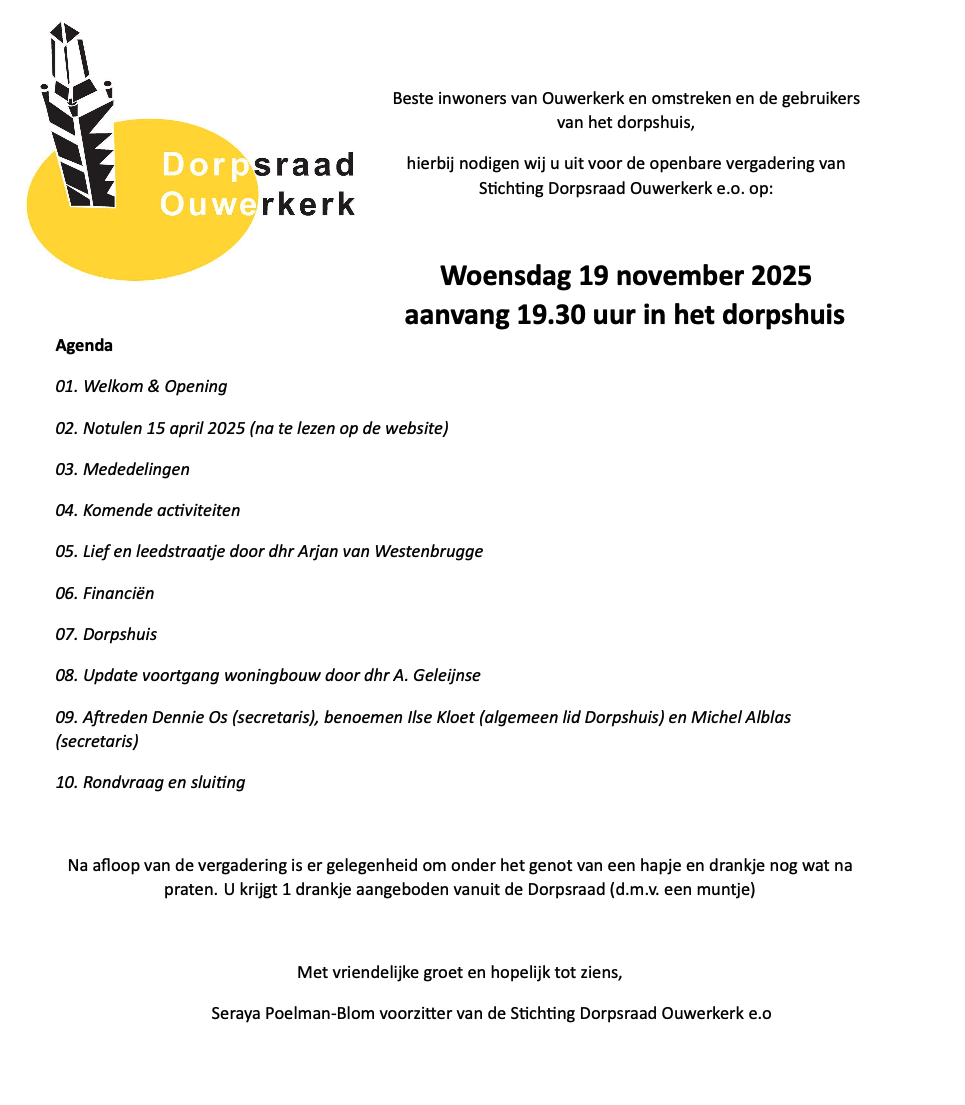 Hierbij nodigen wij u uit voor de openbare vergadering van Stichting Dorpsraad Ouwerkerk e.o. op woensdag 19 november 2025. Aanvang 19:30 uur in het dorpshuis.