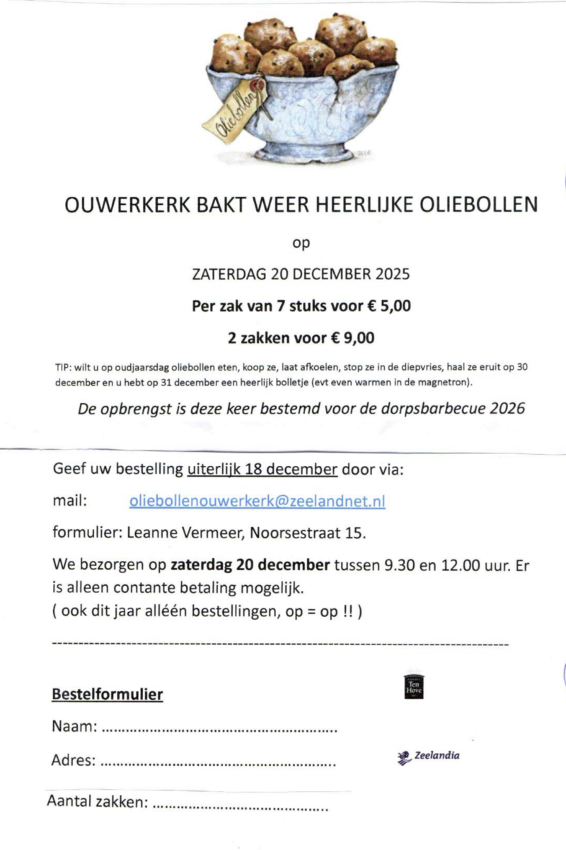 Ouwerkerk bakt weer heerlijke oliebollen op zaterdag 20 december 2025. De opbrengst is bestemd voor de dorpsbarbecue 2026. Geef uw bestelling uiterlijk 18 december door via: oliebollenouwerkerk@zeelandnet.nl